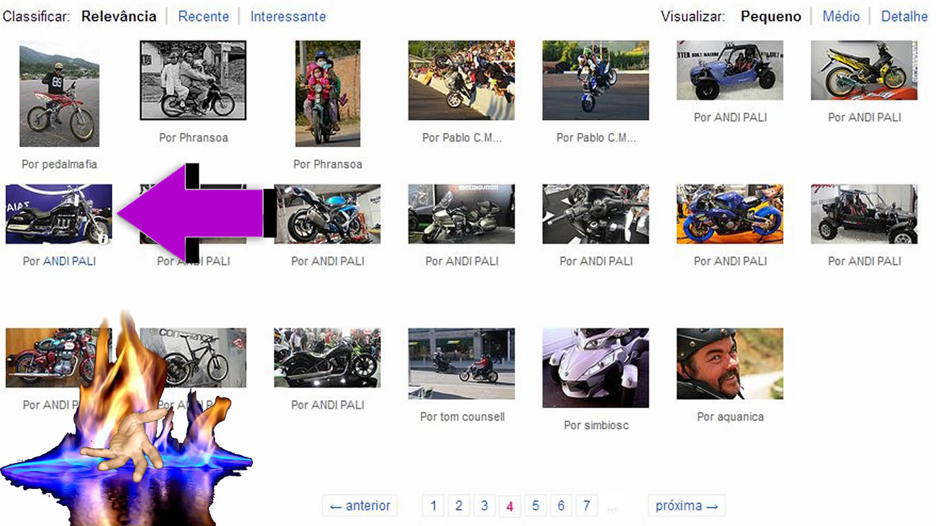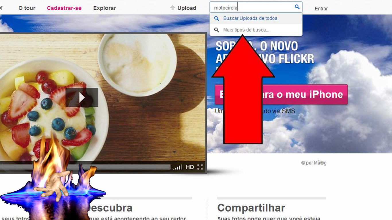 Acessar ao Flickr www.flickr.com usando o Google Chrome. logo no topo da página você verá a caixa de pesquisa. (Veja a foto). Aqui como exemplo farei uma pesquisa de Motos.